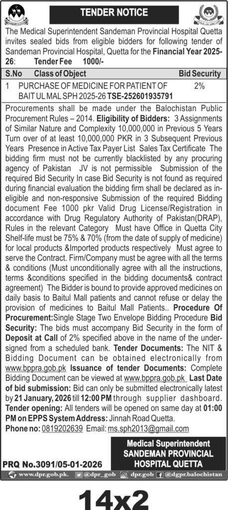 This tender invites bids from qualified suppliers in Quetta for the purchase of medicines for patients of Bait Ul Mal at Sandeman Provincial Hospital for the financial year 2025-26. The procurement is managed by Sandeman Provincial Hospital Quetta under the Balochistan Public Procurement Rules 2014, focusing on medical and pharmaceutical supplies.