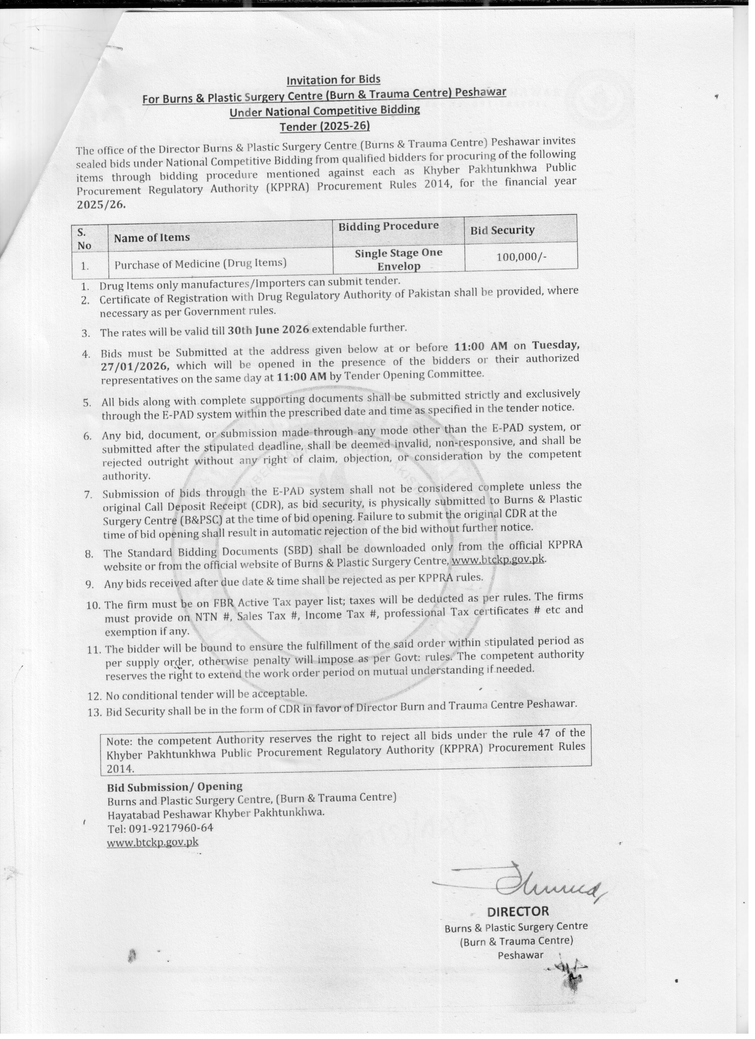 This tender invites qualified manufacturers and importers to supply drug items for the Burns & Plastic Surgery Centre located in Peshawar, Khyber Pakhtunkhwa. The department requires medicines essential for burn and plastic surgery treatments, ensuring the highest standards of pharmaceutical quality and compliance with regulatory norms.