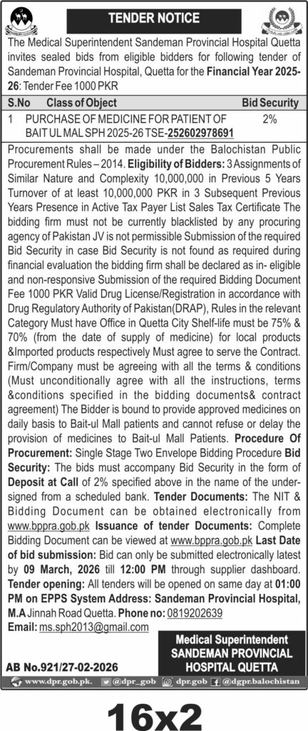 The submission deadline is set for 09 March 2026 at 12:00 PM via the supplier dashboard on the EPPS system. Tender opening will occur the same day at 01:00 PM at Sandeman Provincial Hospital, M.A Jinnah Road, Quetta. Interested parties should obtain bidding documents electronically from www.bppra.gob.pk.
