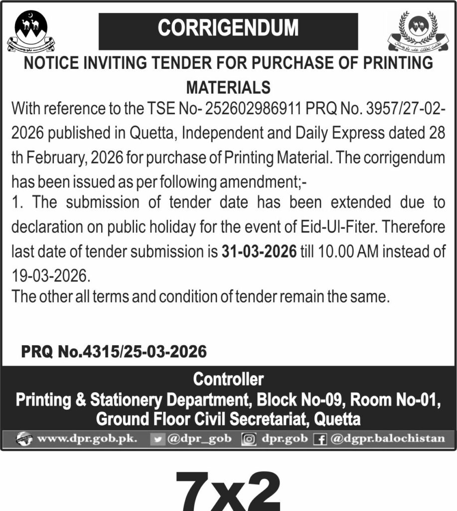 The submission deadline has been extended to 31-03-2026 at 10:00 AM due to a public holiday for Eid-Ul-Fitr. Bids will be opened promptly after the deadline at the Printing & Stationery Department office located at Block No-09, Room No-01, Ground Floor, Civil Secretariat, Quetta.
