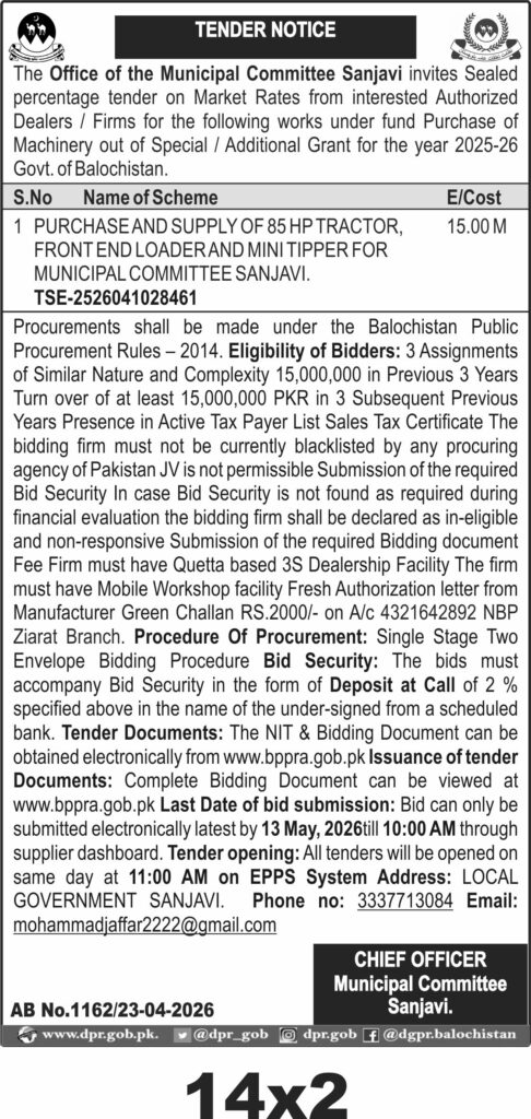 The Office of the Municipal Committee Sanjavi is procuring machinery including an 85 HP tractor, front end loader, and mini tipper under the fund purchase of machinery from the Special/Additional Grant for the fiscal year 2025-26. This procurement is specifically for the Municipal Committee Sanjavi in Balochistan. The technical scope involves supply and delivery of heavy machinery suitable for municipal operations, ensuring quality and compliance with the required specifications.