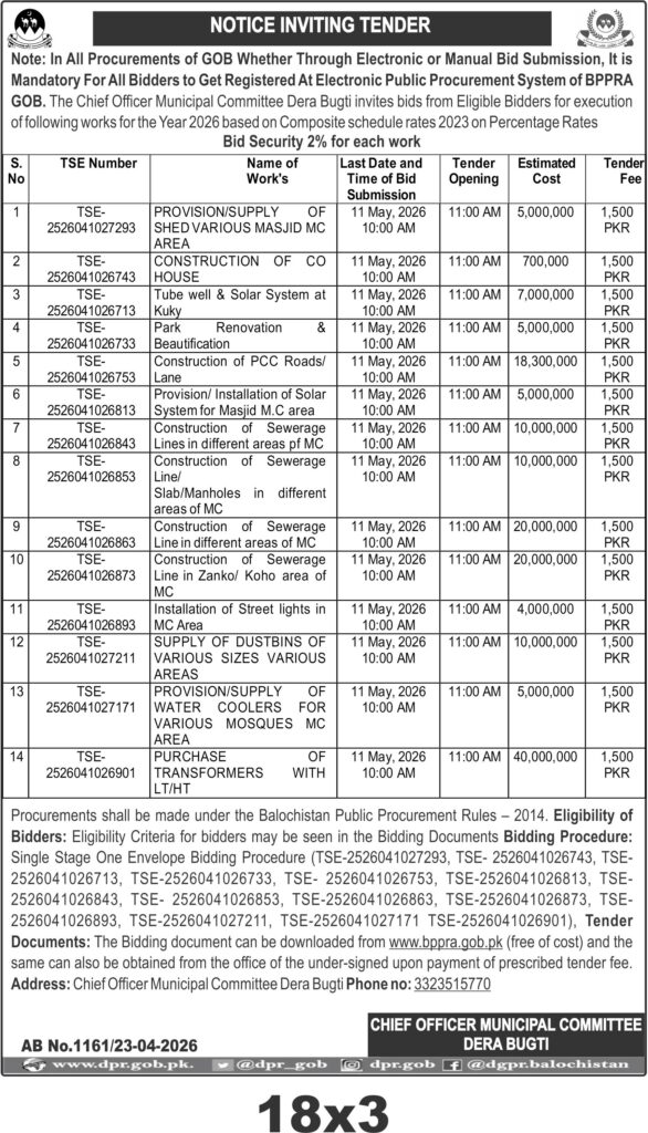 The tender submission deadline is **11 May 2026 at 10:00 AM**, with bid opening scheduled for the same day at 11:00 AM. Bids must be submitted to the office of the Chief Officer Municipal Committee Dera Bugti. The earnest money (bid security) is set at 2% of the estimated cost, and a tender fee of PKR 1,500 is applicable.