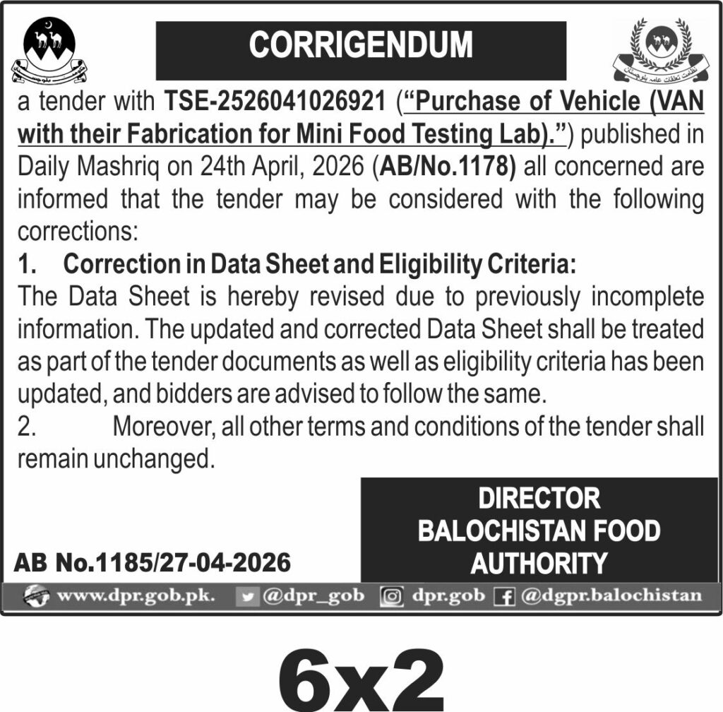 Eligible bidders are advised to carefully review the updated Data Sheet and eligibility criteria as published by the Balochistan Food Authority. Compliance with PEC registration, FBR/ATL status, and relevant experience in vehicle supply and fabrication for specialized purposes will be essential. Earnest Money and CDR requirements must be met as per tender documents.