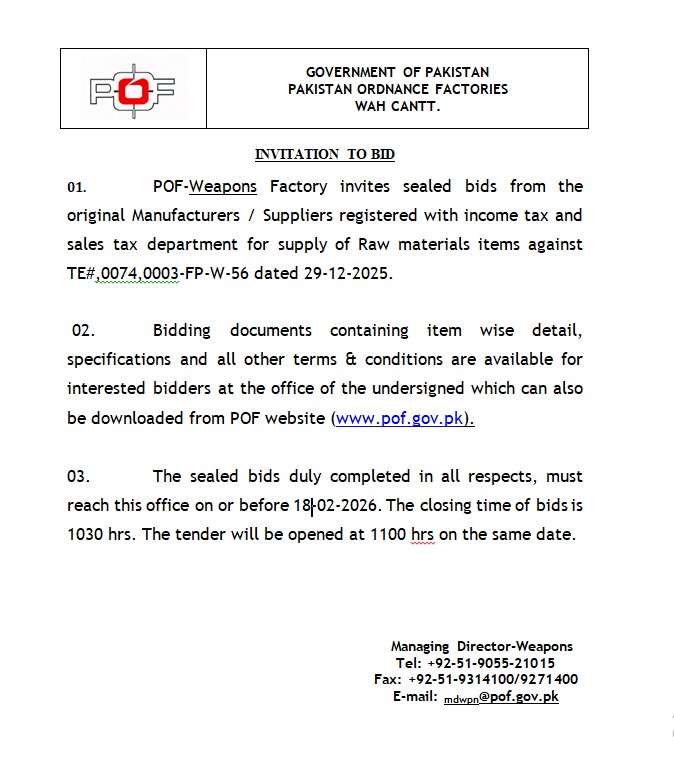 ποΈ Issuing Authority:Pakistan Ordnance Factories, Wah Cantt