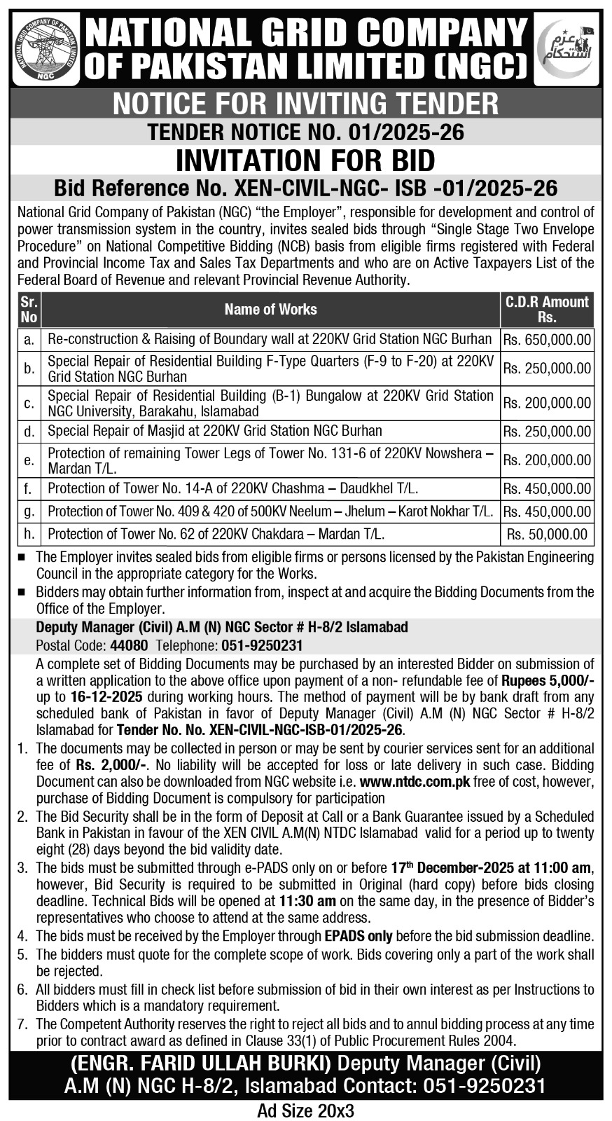 This tender invites sealed bids for the reconstruction and special repair works at various 220KV and 500KV grid stations including boundary walls, residential buildings, masjid, and protection of transmission towers. The scope covers multiple locations such as NGC Burhan, NGC University Islamabad, Nowshera, Chashma, Neelum-Jhelum, and Chakdara.