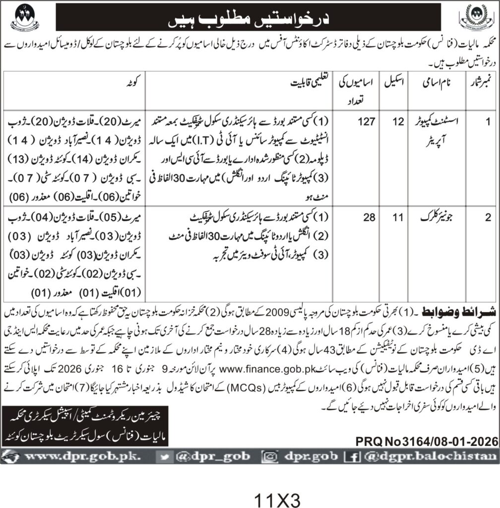 Recruitment of Assistant Computer Operator and Junior Clerk for Balochistan Finance Department