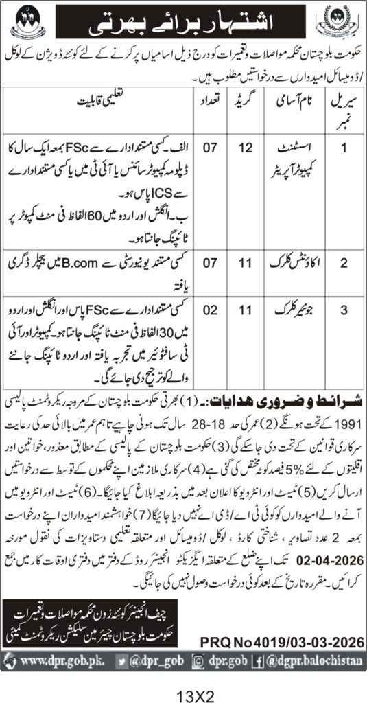 The last date for submission of applications is 2nd April 2026, with applications to be submitted during office hours at the office of the District Engineer, Planning and Development Department, Quetta. The test and interview dates will be announced later.