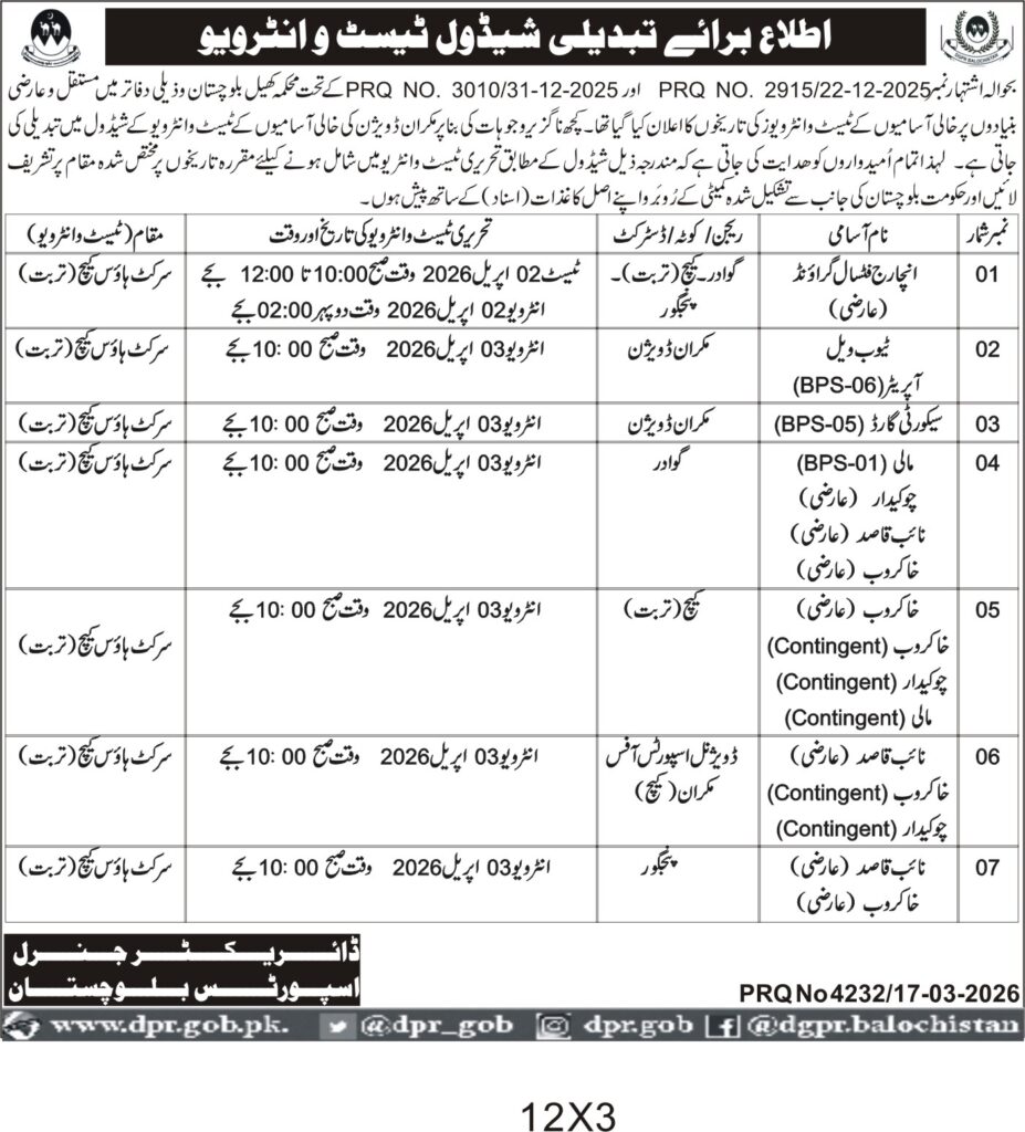 Recruitment of Drivers, Electricians, Cleaners, Sweepers for Balochistan Department of Public Works
