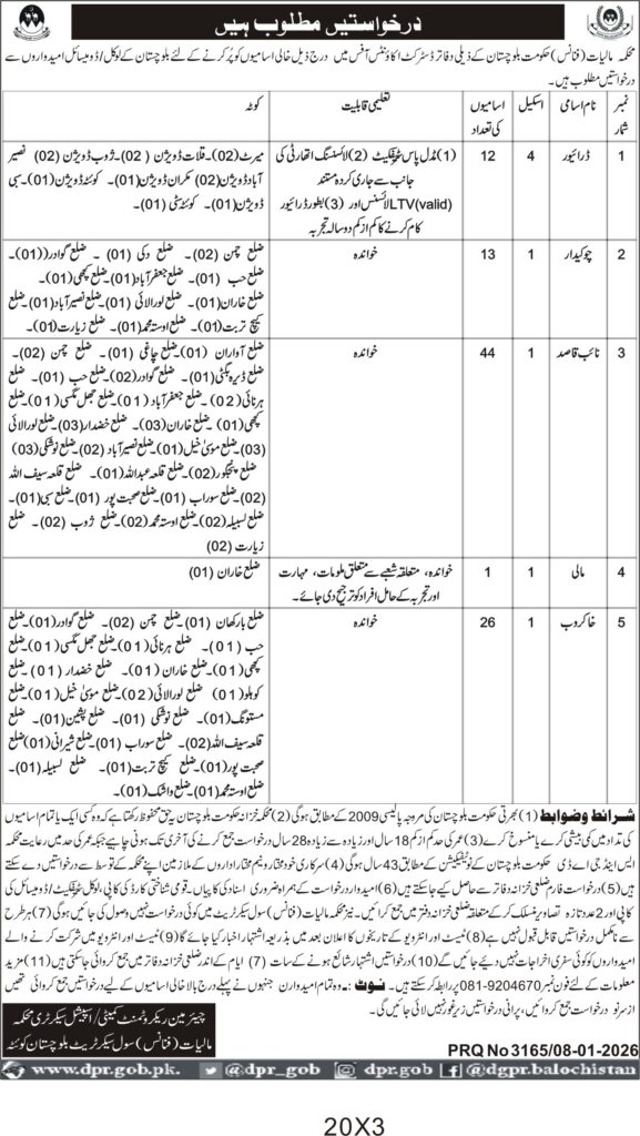 This recruitment drive by the Balochistan Excise and Taxation Department in Quetta seeks qualified candidates for multiple posts including Drivers, Chowkidar, Naib Qasid, Mali, and Naib Mohtasib. The department requires skilled personnel to fill 44 vacancies across various districts of Balochistan, ensuring effective administrative and operational support.