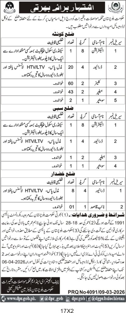 This recruitment notice from the Government of Balochistan's Department of Public Works in Quetta invites applications for various positions including drivers, electricians, cleaners, and sweepers. The department seeks qualified candidates to fill these roles across multiple districts including Quetta, Sibi, and Khuzdar, ensuring operational efficiency in public infrastructure maintenance.