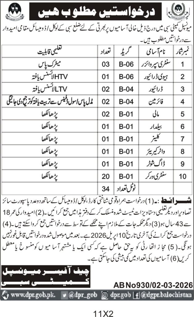 This recruitment drive by the Municipal Committee Sibi in Balochistan focuses on filling 34 vacant positions including drivers, security personnel, and various support staff. The recruitment is aimed at strengthening the operational capacity of the committee in Sibi, ensuring efficient municipal services and security.
