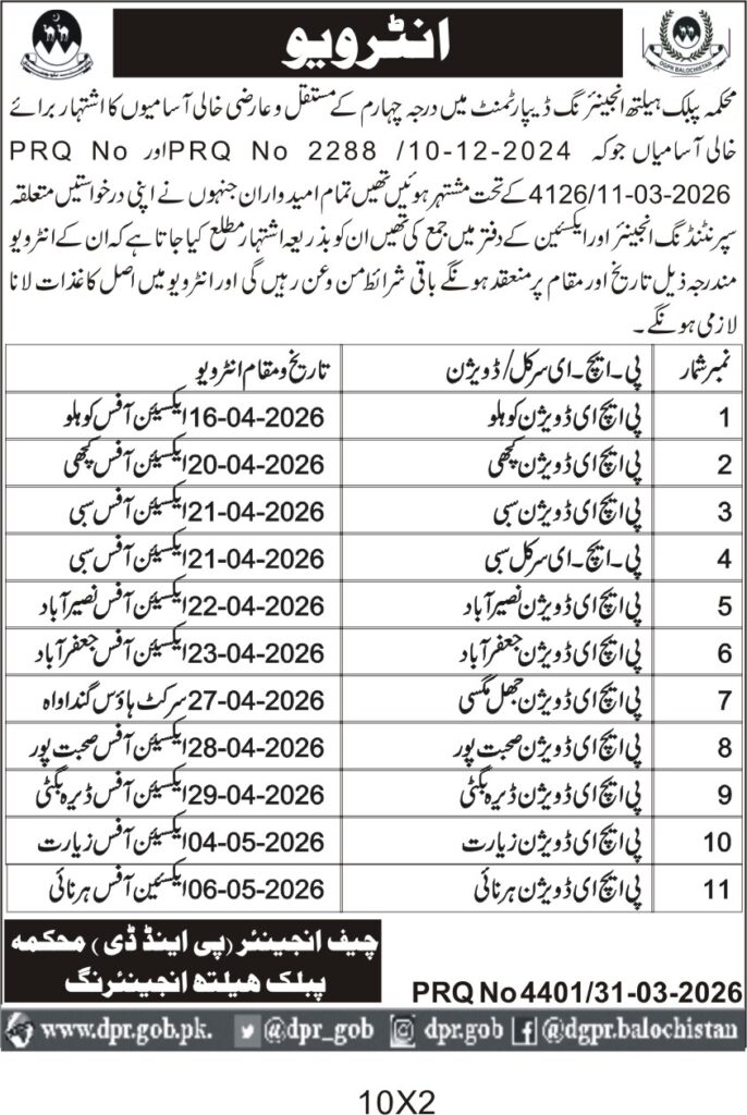 The final submission deadline is on the 6th of May 2026, with the opening of applications scheduled shortly after. Interested candidates must submit their applications in sealed envelopes to the respective divisional offices as per the schedule. The Chief Engineer (P&D) Public Health Engineering Department Balochistan oversees the recruitment process.