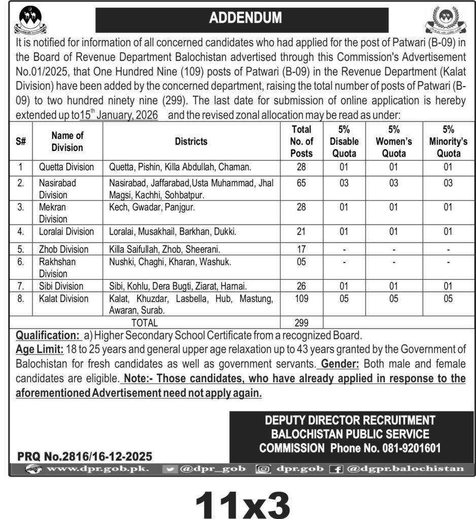 The Board of Revenue Department Balochistan invites applications for 299 Patwari (B-09) posts across multiple divisions including Quetta, Nasirabad, Mekran, and others. This recruitment is for the Revenue Department in Quetta city under the category of human resource services. The total number of posts has been increased from 109 to 299 with zonal allocations specified for each division. The recruitment requires candidates to have a Higher Secondary School Certificate with age limits from 18 to 25 years and upper age relaxation up to 43 years for government servants. Both male and female candidates are eligible to apply. The last date for submission of online applications is 15th January 2026. The recruitment is managed by the Balochistan Public Service Commission with contact phone number 081-9201601. Candidates who have already applied in response to the previous advertisement need not apply again.