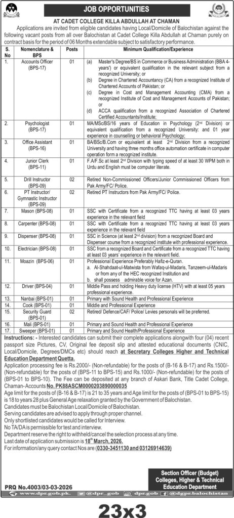 This recruitment drive is announced by the Colleges, Higher and Technical Education Department Balochistan for multiple staff positions at Cadet College Killa Abdullah located in Chaman. The recruitment targets local candidates domiciled in Balochistan, covering a wide range of roles from Accounts Officer to Security Guards, ensuring a diverse staffing solution for the institution.