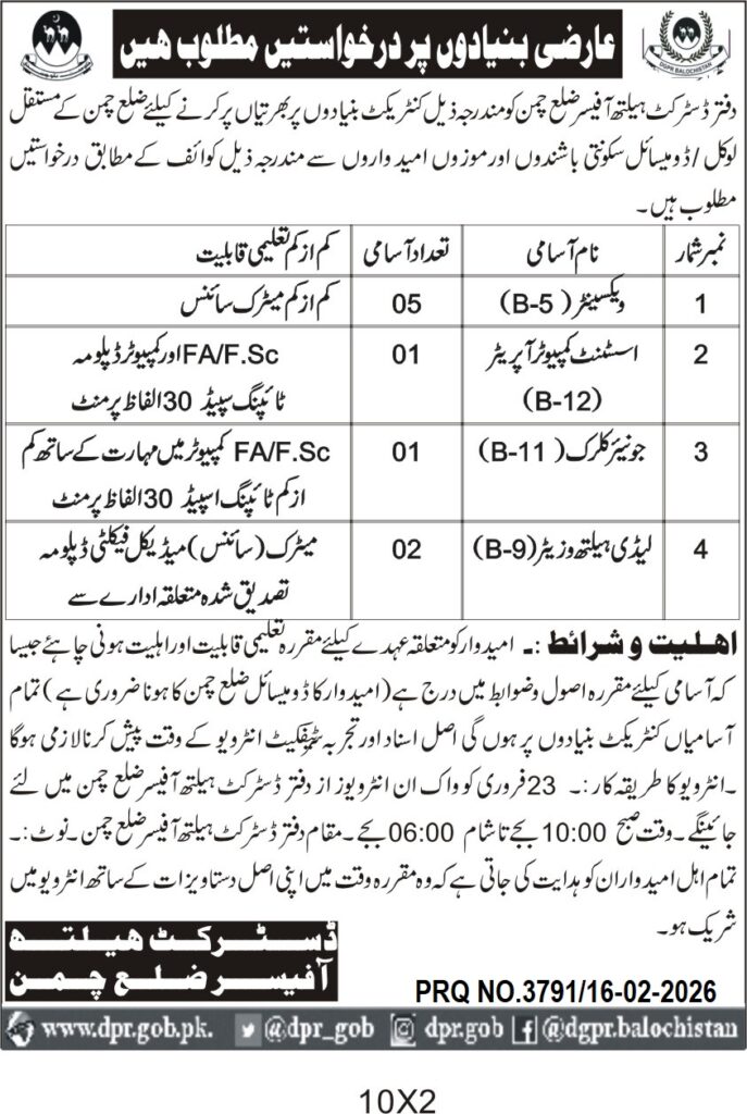 This recruitment notice from the District Health Officer in Chaman, Balochistan, invites applications for multiple technical positions including Vaccinators, Assistant Computer Operator, Junior Clerk, and Lady Health Workers. The department seeks qualified candidates with relevant educational backgrounds such as matriculation, FA/F.Sc, and computer diplomas to fill these roles. The recruitment is aimed at strengthening the district's health services by deploying skilled personnel.