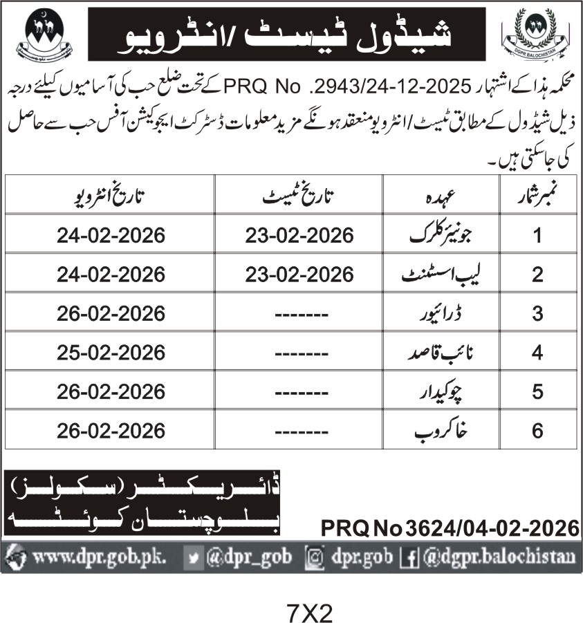 The final submission deadline is on 26th February 2026, with interviews and tests conducted at the Director Schools office in Quetta. Interested candidates should submit sealed applications as per instructions and attend interviews punctually.