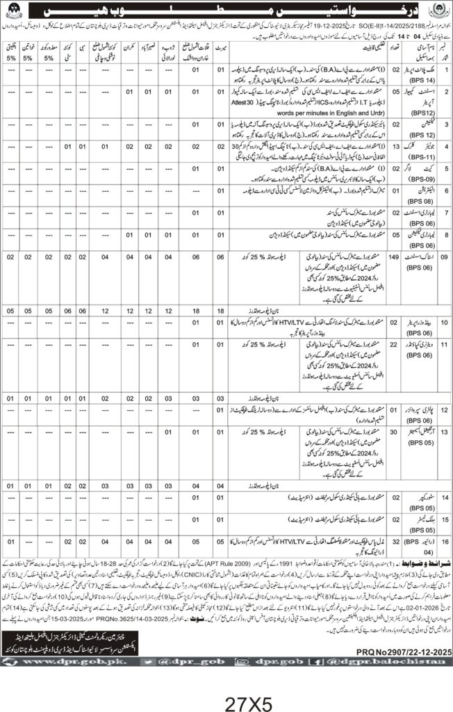 Recruitment of Drivers, Electricians, Cleaners, Sweepers for Balochistan Department of Public Works
