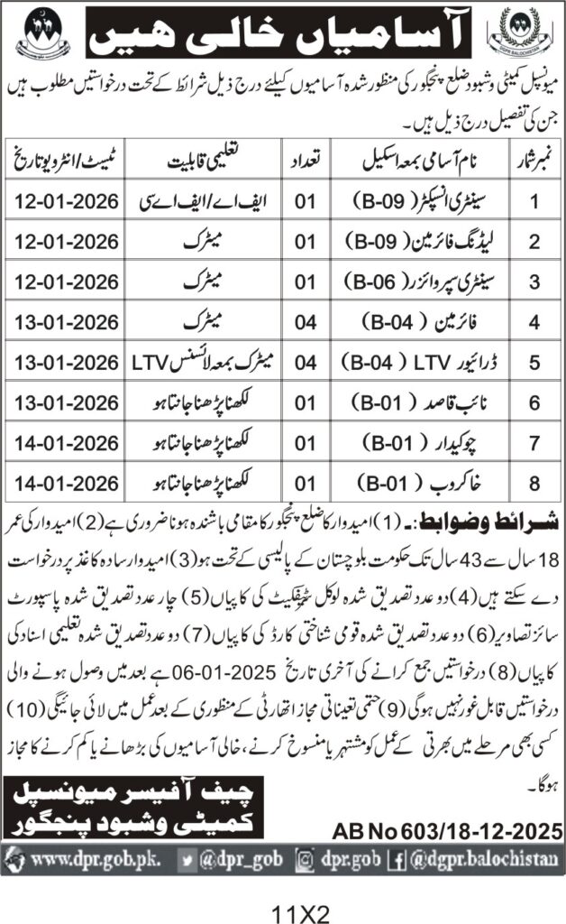 Applicants must be residents of Washuk district and submit applications by January 6, 2025. Required documents include educational certificates, national ID, passport size photos, and local domicile. Incomplete or late applications will not be considered. The Chief Officer Municipal Committee Washuk oversees the process.