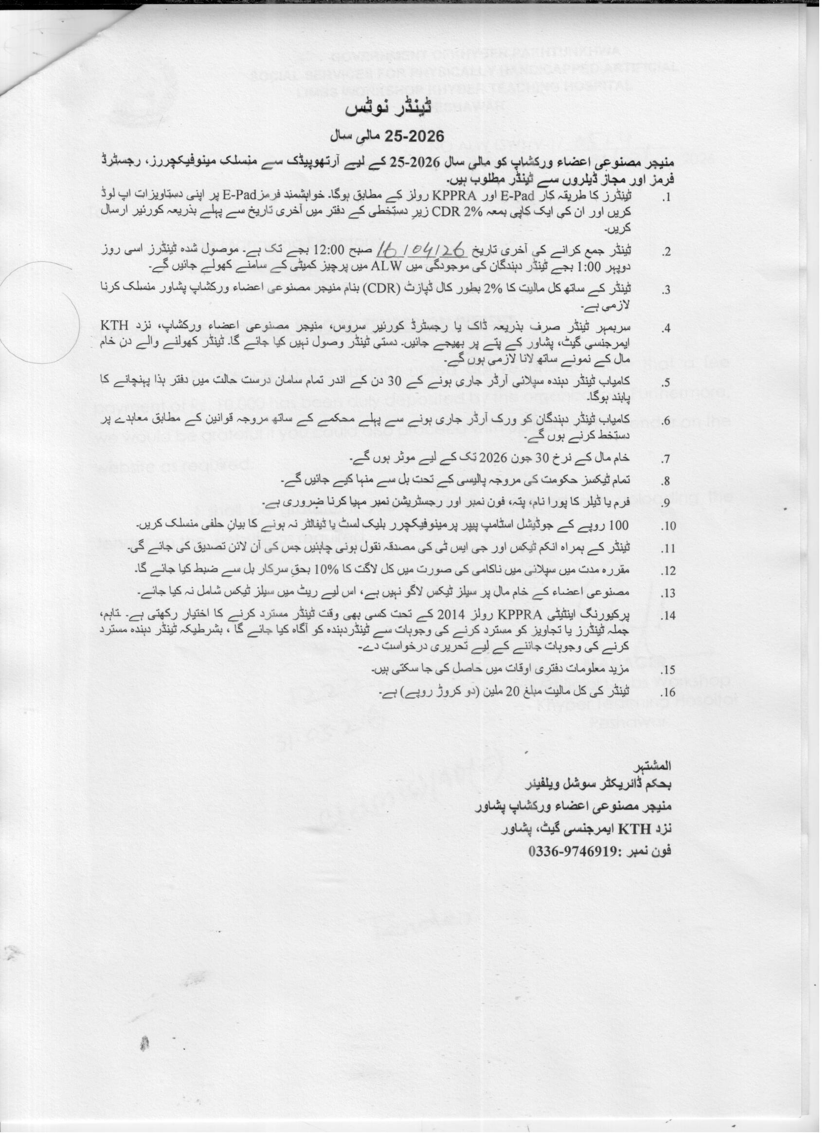 The submission deadline is set for 16th April 2026 at 12:00 PM, with bids opening at 1:00 PM the same day at the ALW premises. Interested parties must submit sealed bids along with the required CDR to the Manager Artificial Limb Members office near the Emergency Gate, KTH, Peshawar.