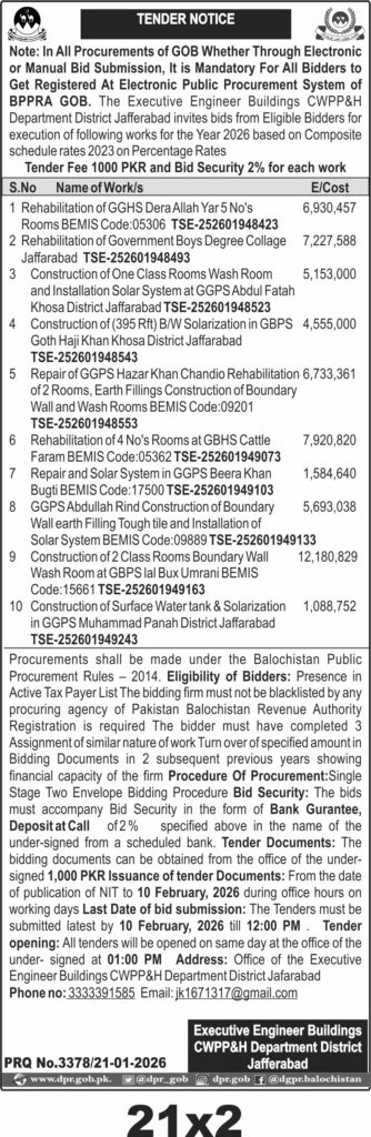 The submission deadline is set for 10 February 2026 at 12:00 PM, with bid opening scheduled the same day at 1:00 PM at the Executive Engineer Buildings CWPP&H Department office in Jaffarabad. Bidders must submit sealed bids following the single stage two envelope procedure.