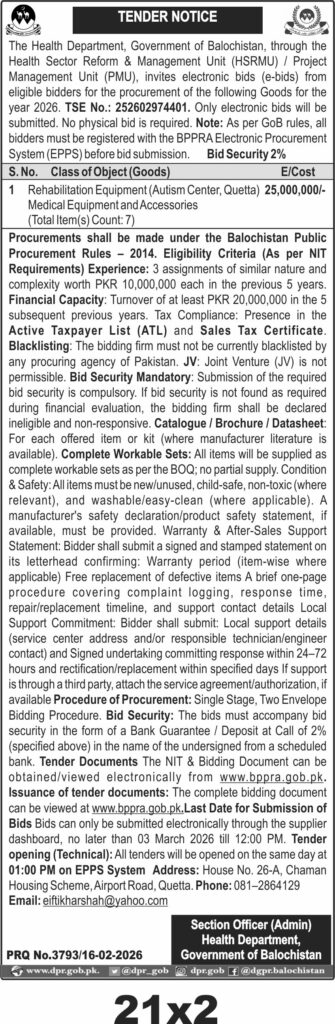 This tender invites electronic bids for the procurement of rehabilitation and medical equipment specifically for the Autism Center located in Quetta, Balochistan. Issued by the Health Department, Government of Balochistan, it focuses on supplying seven complete workable sets of medical equipment and accessories designed to support rehabilitation services. The procurement is conducted under the Balochistan Public Procurement Rules 2014, ensuring transparency and compliance with local regulations.