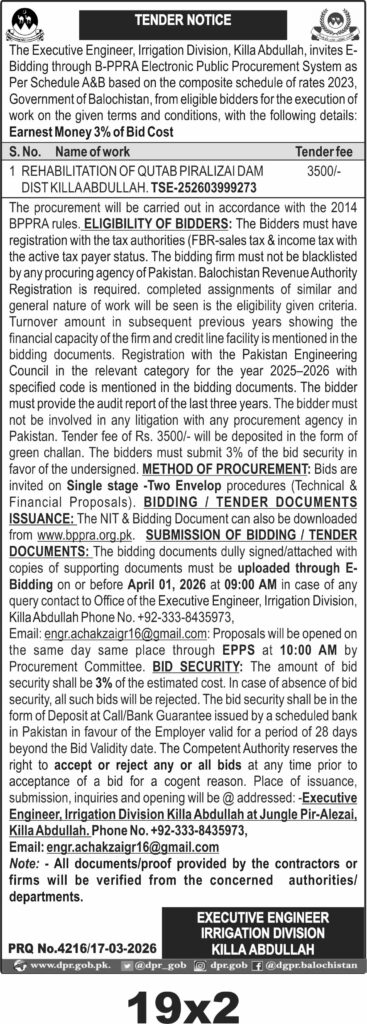 This tender invites bids for the rehabilitation of Qutab Piralizai Dam located in Killa Abdullah, Balochistan, under the Executive Engineer Irrigation Division. The project falls under the Construction & Civil Works category and requires experienced contractors to execute the work as per the composite schedule of rates 2023 issued by the Government of Balochistan.
