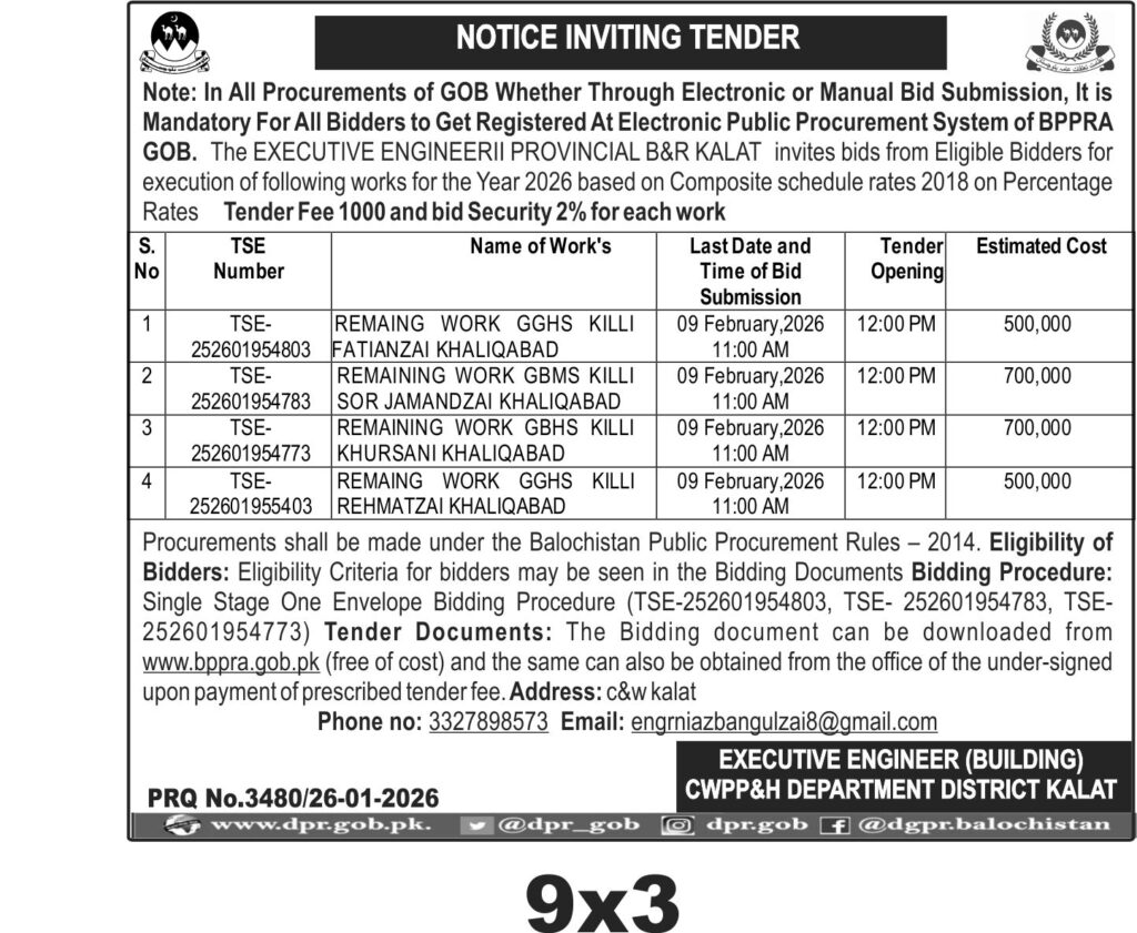 The deadline for bid submission is set for 09 February 2026 at 11:00 AM, with tender opening scheduled at 12:00 PM the same day. Bids must be submitted in a sealed envelope to the office of the Executive Engineer (Building), CWPP&H Department District Kalat. Interested bidders can download bidding documents free of cost from www.bppra.gob.pk or obtain them from the department upon payment of the tender fee.