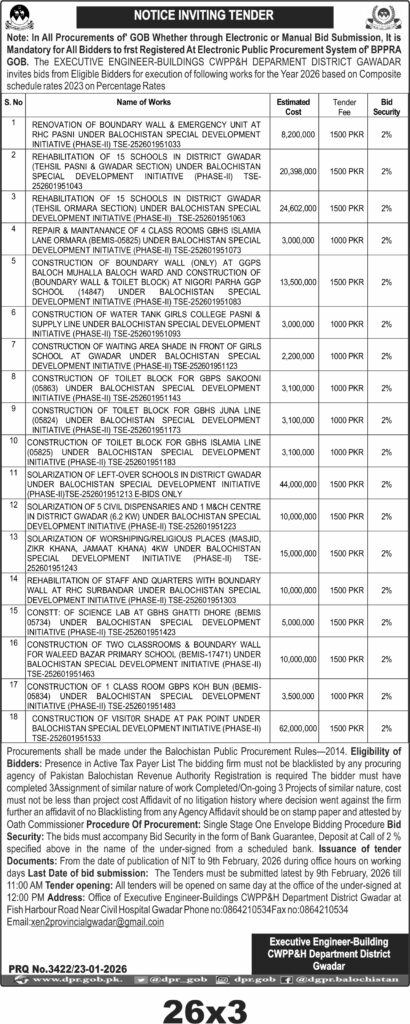 The submission deadline is set for 9th February 2026 by 11:00 AM, with technical bids opening the same day at 12:00 PM. Bids must be submitted in sealed envelopes to the office of the Executive Engineer-Buildings CWPP&H Department District Gwadar, located at Fish Harbour Road near Civil Hospital Gwadar. Interested parties should obtain tender documents during office hours from the date of publication until the closing date.