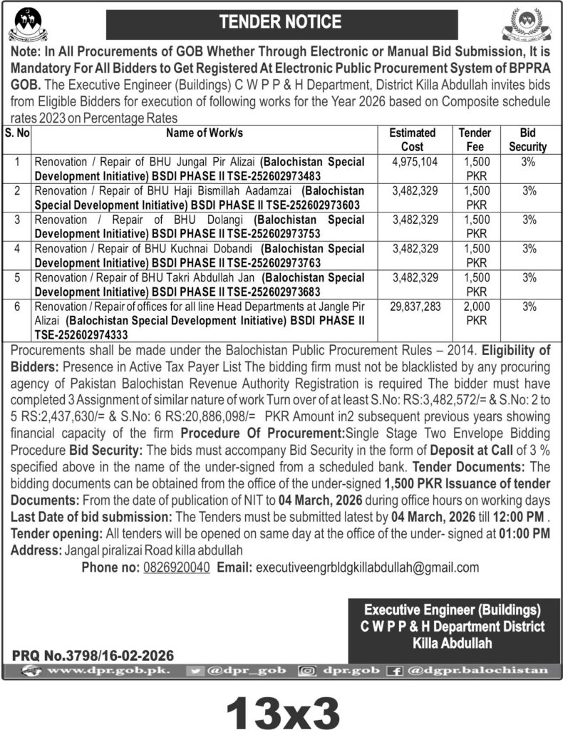 This tender invites bids for the renovation and repair of Basic Health Units (BHUs) and departmental offices in Killa Abdullah, Balochistan, under the Balochistan Special Development Initiative (BSDI) Phase II. The department requires skilled contractors to execute civil works including structural repairs, refurbishment, and maintenance of health facilities and administrative offices. The projects are based on composite schedule rates 2023 and cover multiple sites including BHU Jungal Pir Alizai, BHU Haji Bismillah Aadamzai, BHU Dolangi, BHU Kuchnai Dobandi, BHU Takri Abdullah Jan, and offices for all line head departments at Jangal Pir Alizai. These works demand careful handling of local materials and adherence to engineering standards suitable for the region's climatic and geographic conditions. The scope includes masonry, plastering, painting, and minor electrical and plumbing repairs to ensure functional and safe health service delivery points.