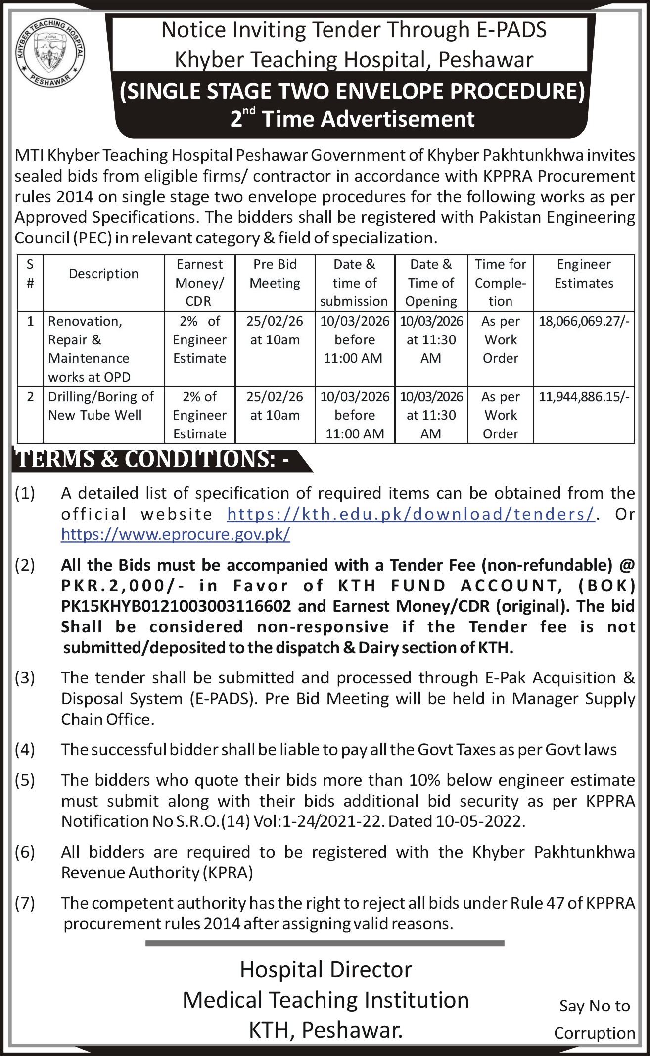 Pro-Tip: Carefully review the newspaper advertisement for specific instructions on tender fee payment and Earnest Money Call Deposit Receipt (CDR) submission, as missing these often leads to disqualification. Also, ensure bids quoting more than 10% below the engineer's estimate include additional bid security as per KPPRA notification.