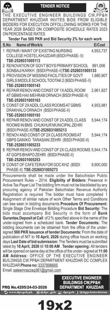 The submission deadline is set for 10 April 2026 at 10:00 AM, with tender opening at 11:00 AM the same day. Bids must be submitted physically at the office of the Executive Engineer Buildings CW, PP&H Department Khuzdar, located at DC Complex Khuzdar. Tender documents are available for a fee of 500 PKR during office hours until the submission date.