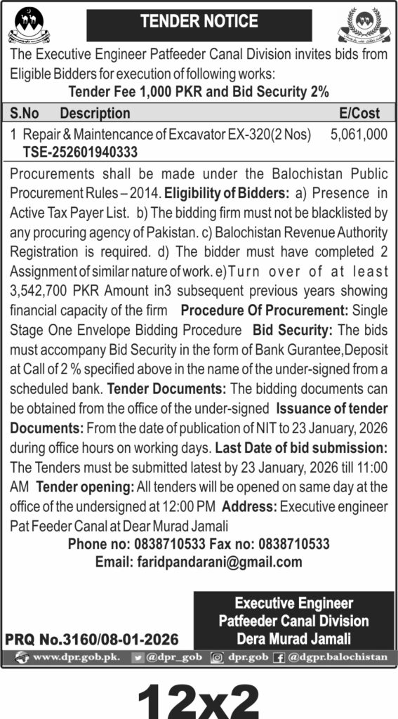 This tender invites bids for the repair and maintenance of two Excavator EX-320 units at the Patfeeder Canal Division in Dera Murad Jamali, Balochistan. The department requires skilled contractors to ensure the excavators are restored to optimal working condition, addressing mechanical and operational issues to support canal maintenance activities efficiently.