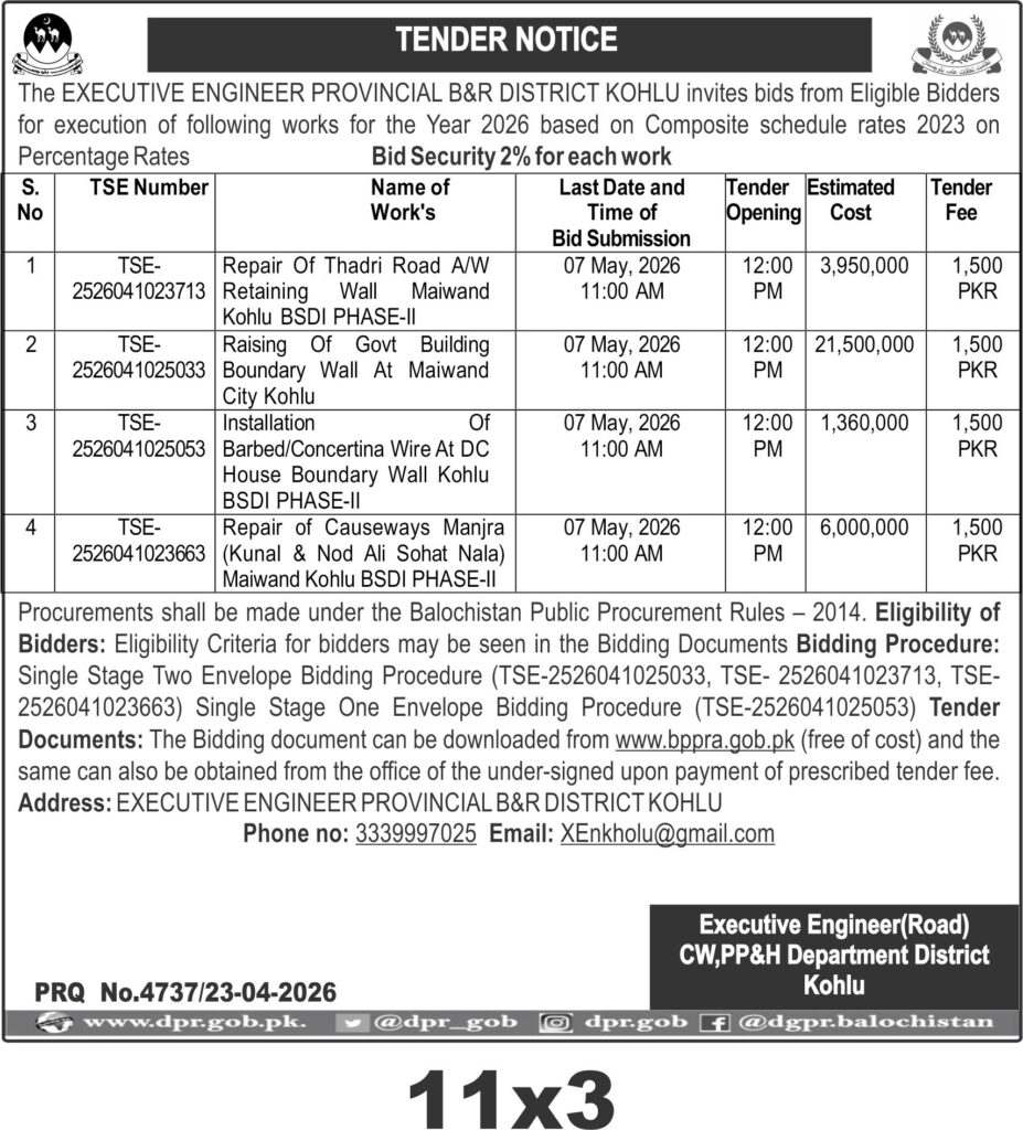 The Public Works and Highways Department District Kohlu is procuring multiple civil works for the fiscal year 2026. The projects include repair of Thadri Road along with retaining wall at Maiwand, raising of government building boundary wall at Maiwand city, installation of barbed and concertina wire at DC House boundary wall, and repair of causeways at Manjra (Kunal & Nod Ali Sohat Nala) in Maiwand Kohlu. These works are based on composite schedule rates 2023 and require bidders to provide 2% bid security for each work.