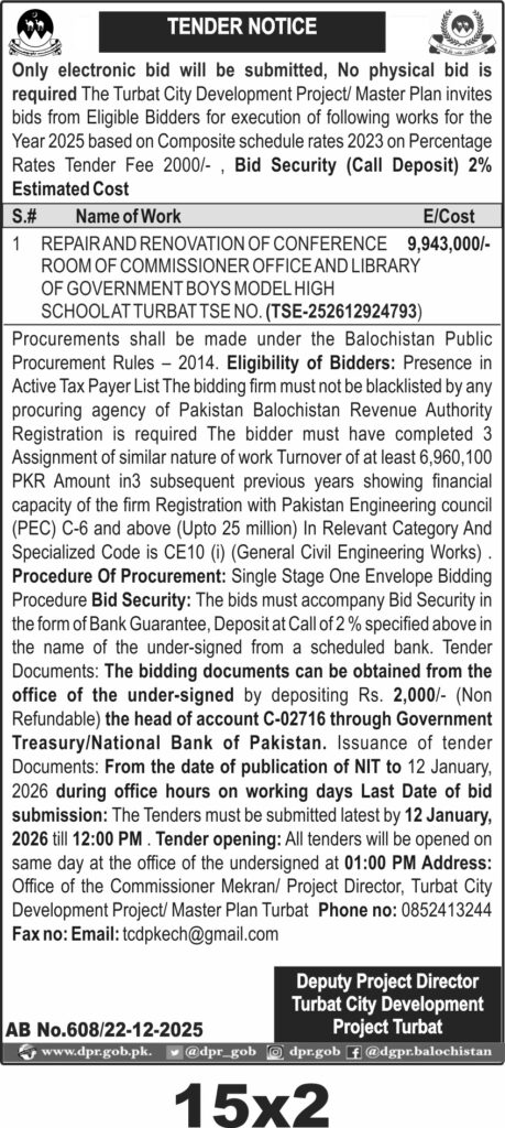Bids must be submitted electronically by 12 January 2026 at 12:00 PM. Tender opening will occur the same day at 1:00 PM at the office of the Commissioner Mekran. Contact details and eligibility criteria are provided for interested bidders.