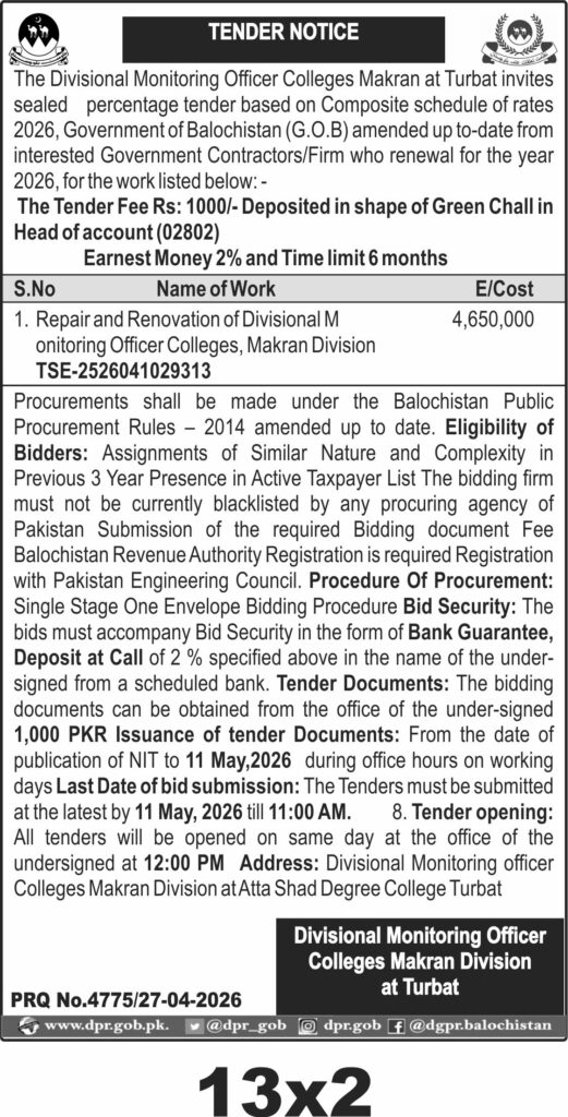 The Divisional Monitoring Officer Colleges Makran Division at Turbat is procuring repair and renovation works for its colleges. This tender invites sealed percentage bids based on the Composite Schedule of Rates 2026, Government of Balochistan (G.O.B) amended up to date. The scope includes comprehensive repair and renovation activities at the Divisional Monitoring Officer Colleges in Makran Division, Turbat. The estimated cost for this project is **PKR 4,650,000**.