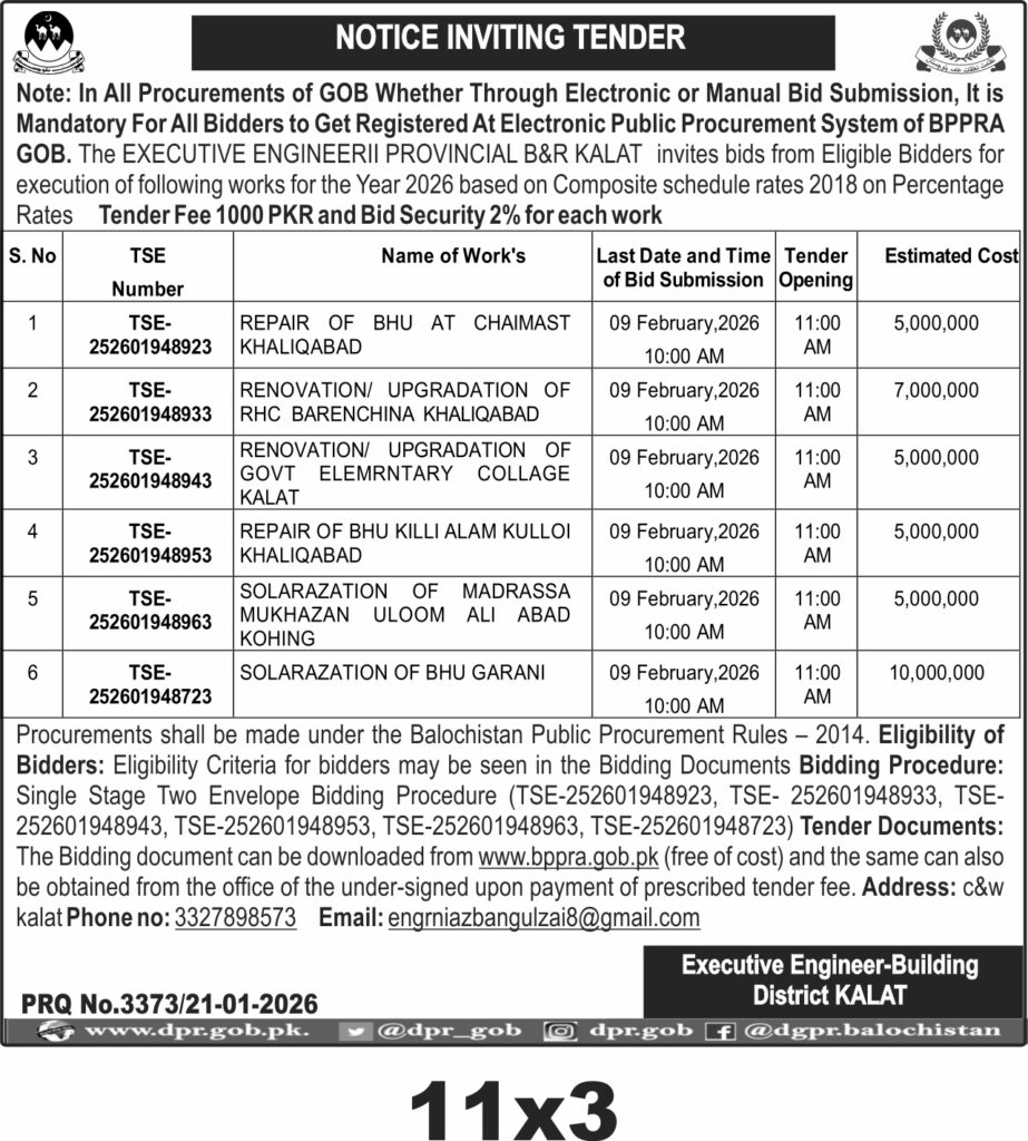 The submission deadline is set for 09 February 2026 at 10:00 AM, with bid opening scheduled at 11:00 AM on the same day. Bids must be submitted physically to the office of the Executive Engineer-Building District Kalat. Interested parties can obtain bidding documents free of cost from www.bppra.gob.pk or from the office upon payment of the prescribed fee.