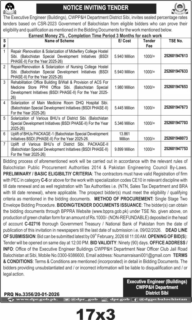 Submission deadline is set for 09 February 2026 at 11:00 AM, with bid opening at 12:00 PM the same day. Bidders should submit sealed bids to the Executive Engineer Buildings CWPP&H Department office near Officer Club Jail Road, Sibi. Tender documents are available via the BPPRA website upon payment of a non-refundable fee of PKR 1000.