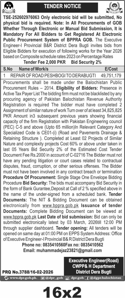 The submission deadline is set for 03 March 2026 at 12:00 PM, with electronic bids only accepted via the BPPRA supplier dashboard. Tender opening will occur the same day at 01:00 PM on the EPPS system. Interested bidders should obtain bidding documents electronically from www.bppra.gob.pk. The office of the Executive Engineer-I Provincial B&R District Dera Bugti is the point of contact for queries.