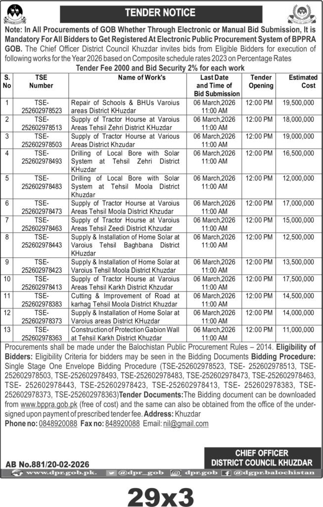 The submission deadline is set for 06 March 2026 at 11:00 AM, with tender opening at 12:00 PM the same day. Bids must be submitted physically at the District Council Khuzdar office. Interested bidders can download bidding documents free of cost from the BPPRA website or obtain them from the office upon payment of the tender fee.