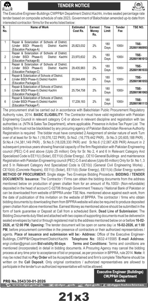 Submission deadline is set for 16-02-2026 at 12:00 PM, with bid opening at 1:00 PM the same day. Documents must be delivered in sealed envelopes to the Executive Engineer Buildings office in Kachhi. Bidding documents are available upon payment of a non-refundable fee of PKR 1000 and can be downloaded from the BPPRA website.
