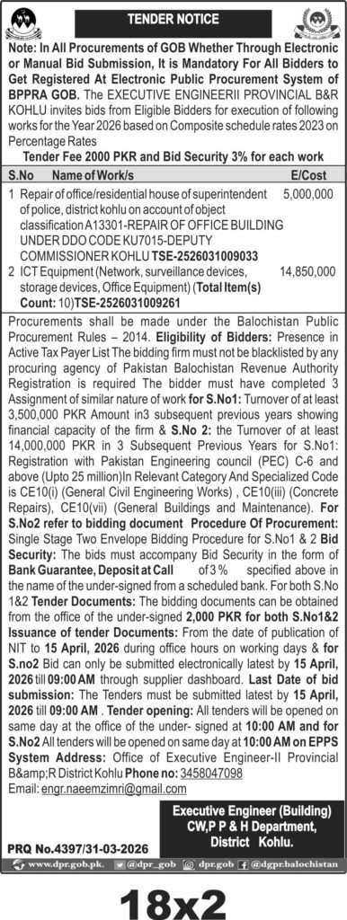 This tender from the Public Works, Power and Housing Department in District Kohlu covers two key procurements: the repair of the office and residential house of the superintendent of police, and the supply of ICT equipment including network, surveillance, storage, and office devices. The repair work involves civil engineering tasks such as concrete repairs and general building maintenance, requiring specialized materials and skilled labor to meet the standards of the Deputy Commissioner’s office. The ICT supply includes ten items essential for modern office functionality, ensuring enhanced security and operational efficiency.