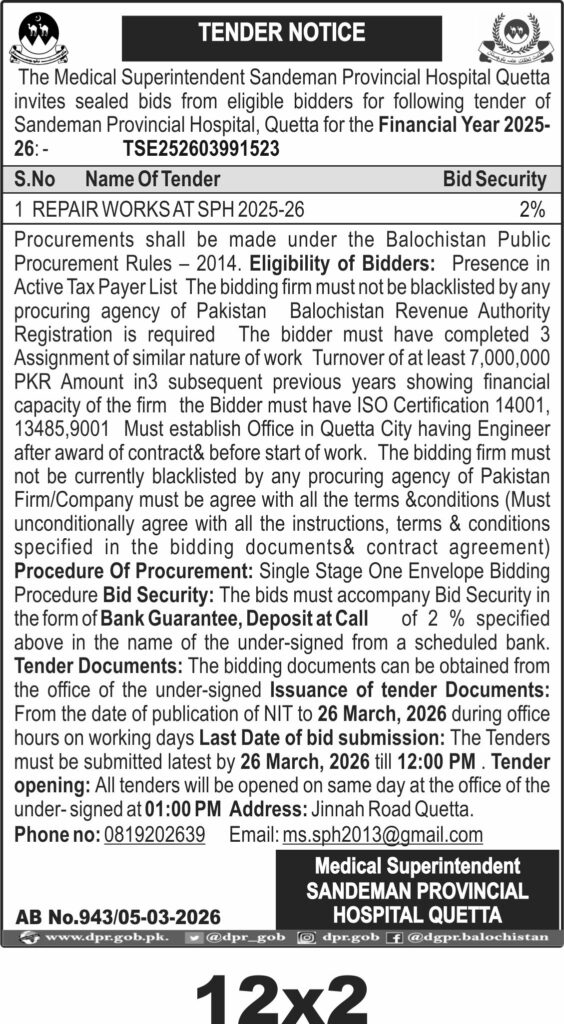 This tender invites bids for repair works at Sandeman Provincial Hospital in Quetta, issued by the Medical Superintendent. The procurement falls under construction and civil works materials, focusing on essential maintenance and repair tasks within the hospital premises in Quetta, Balochistan.