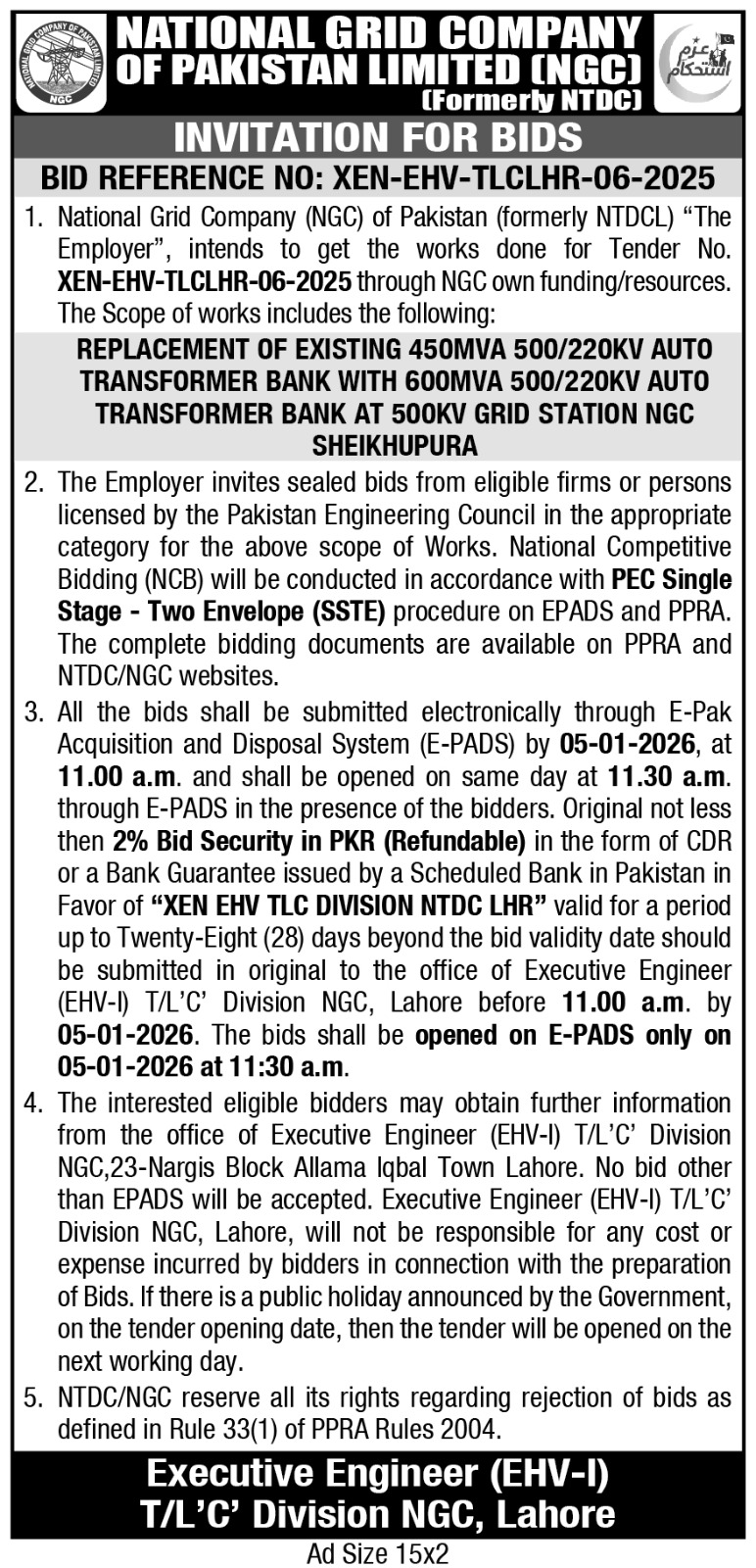 This tender invites sealed bids for replacing a 450MVA 500/220kV auto transformer bank with a 600MVA 500/220kV unit at the 500kV Grid Station Sheikhupura under NGC funding. Bids must be submitted electronically via E-PADS by 5th January 2026 at 11:00 a.m.