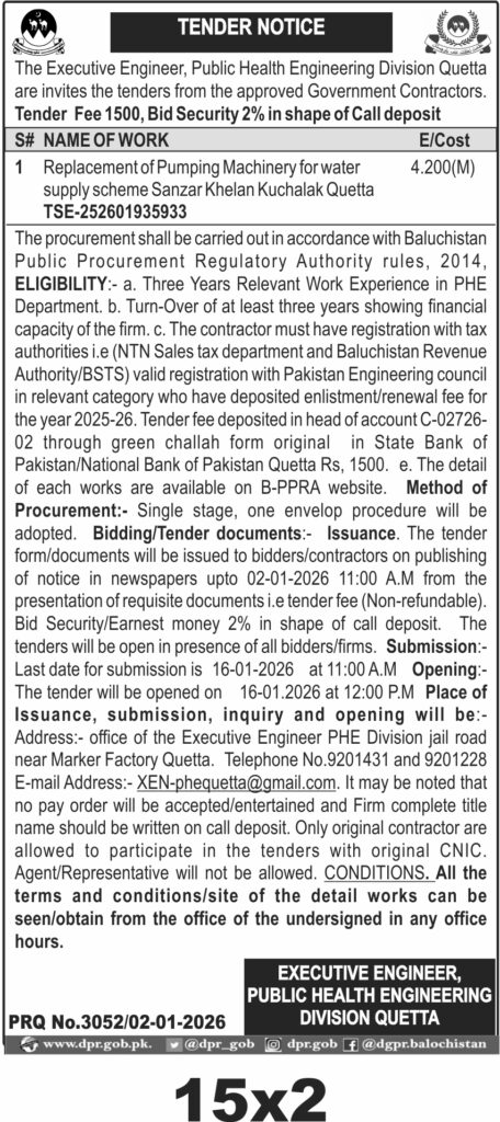 ποΈ Issuing Authority:Public Health Engineering Division Quetta