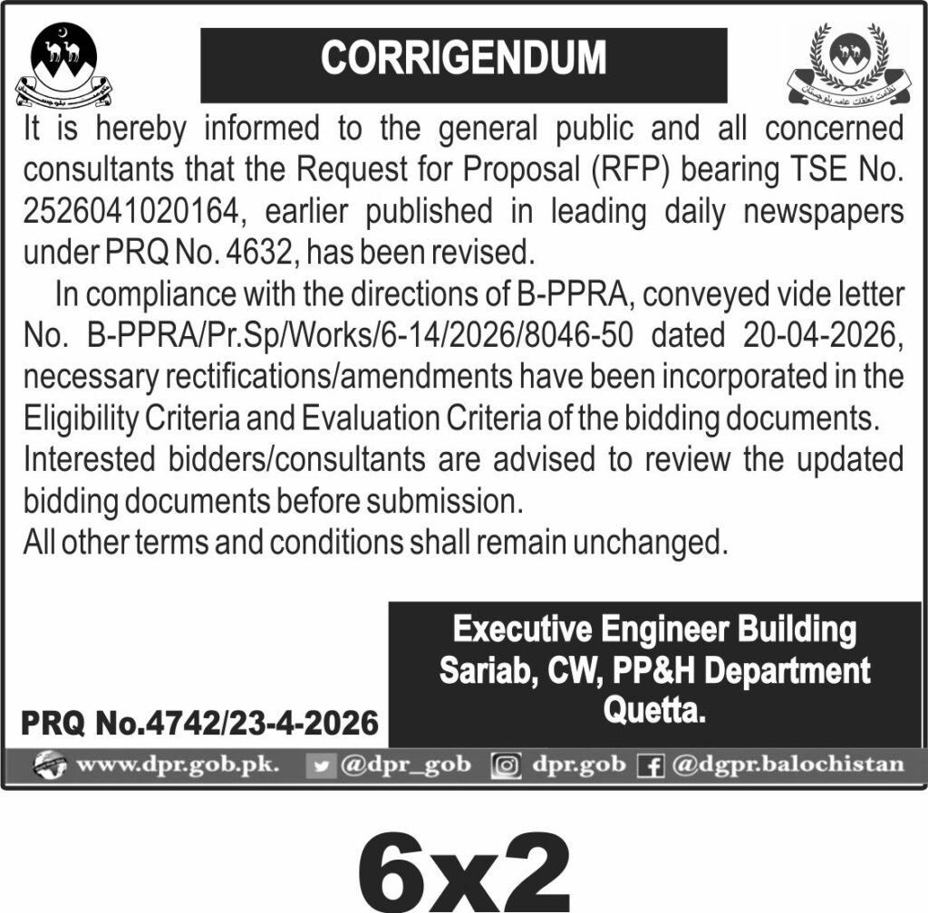 Interested bidders must ensure their submissions comply with the revised criteria and submit their proposals by the deadline. The closing date for submission is set for 27th April 2026 at 23:59:59. Proposals should be delivered to the Executive Engineer Building, Sariab, CW, PP&H Department Quetta.