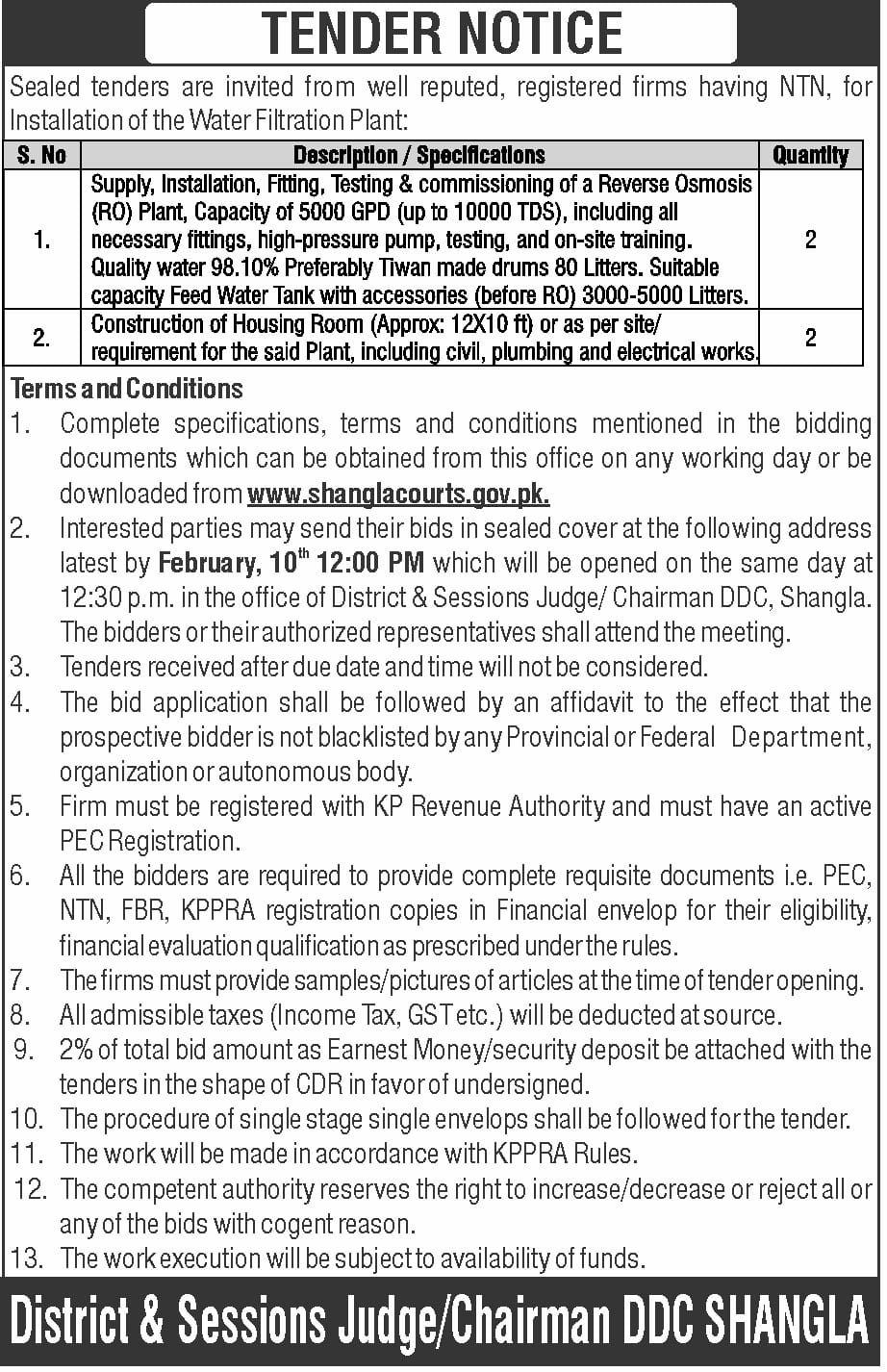This tender invites bids from registered firms for the supply, installation, and commissioning of a Reverse Osmosis (RO) Water Filtration Plant in Shangla under the supervision of the District & Sessions Judge and Chairman DDC. The project includes two RO plants each with a capacity of 5000 GPD, capable of handling up to 10000 TDS, along with all necessary fittings, high-pressure pumps, and on-site training. Additionally, the construction of housing rooms approximately 12x10 feet is required to accommodate the plants, including civil, plumbing, and electrical works.