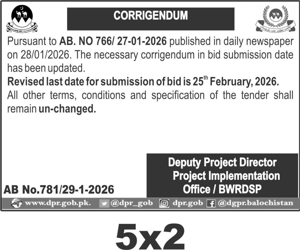 This corrigendum announces a revised deadline for bid submission related to the Project Implementation Office under BWRDSP. The update is crucial for bidders to adjust their schedules accordingly and ensure timely participation in the procurement process.