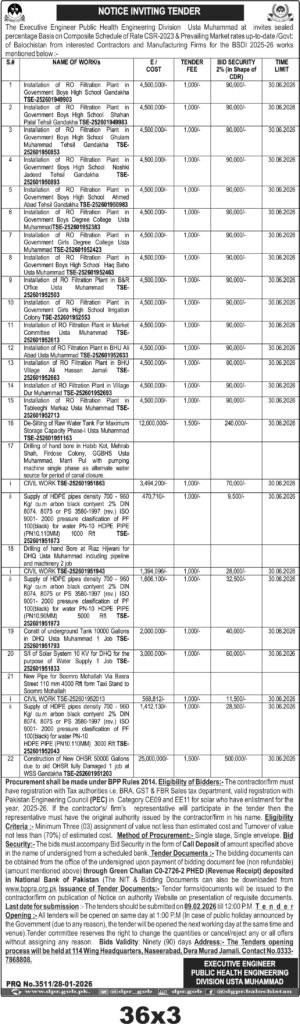 This tender invites contractors and manufacturing firms in Usta Muhammad, Balochistan, to install Reverse Osmosis (RO) Filtration Plants at various government educational institutions and public sites. The Public Health Engineering Division requires these installations to improve water quality and supply in schools, colleges, and community areas. The scope includes civil works such as drilling hand bores, constructing underground water tanks, and supplying HDPE pipes with specified pressure ratings. The projects are spread across multiple locations including Government Boys High Schools, Degree Colleges, and market committees, each with a detailed cost and bid security requirement.