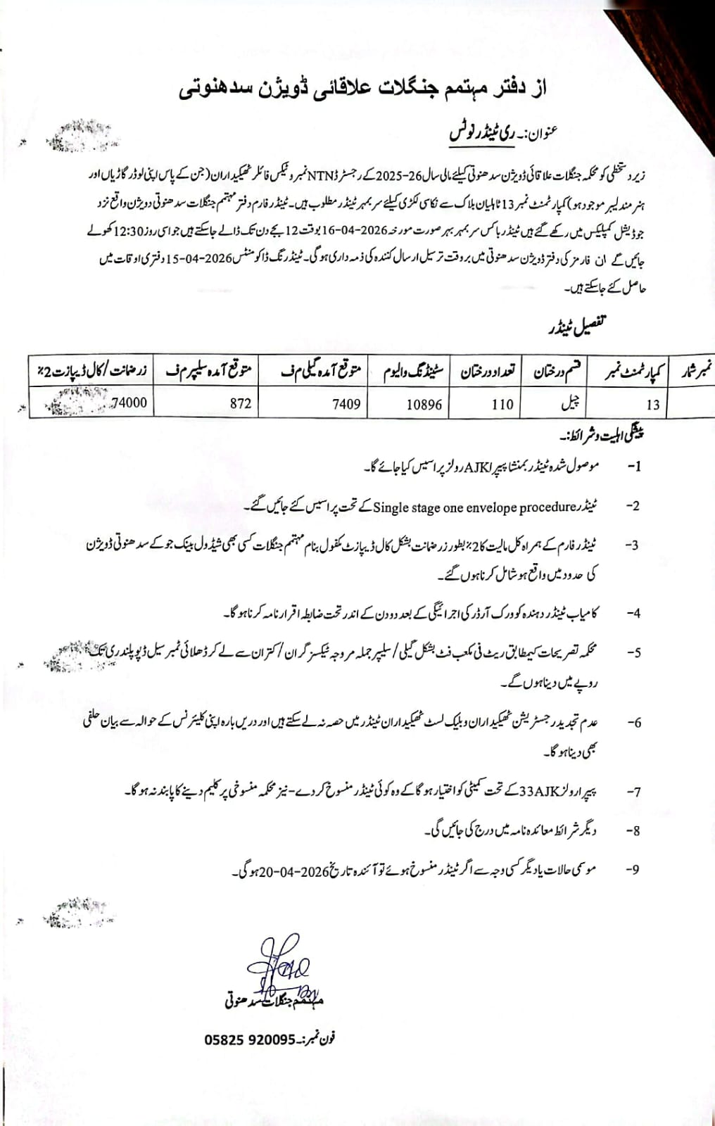 The submission deadline is set for 15th April 2026, with bid opening scheduled at 12:30 PM on the same day. Bids must be submitted in sealed envelopes to the office of the Conservator Forests, Sudhnoti Division. Late submissions will not be entertained.