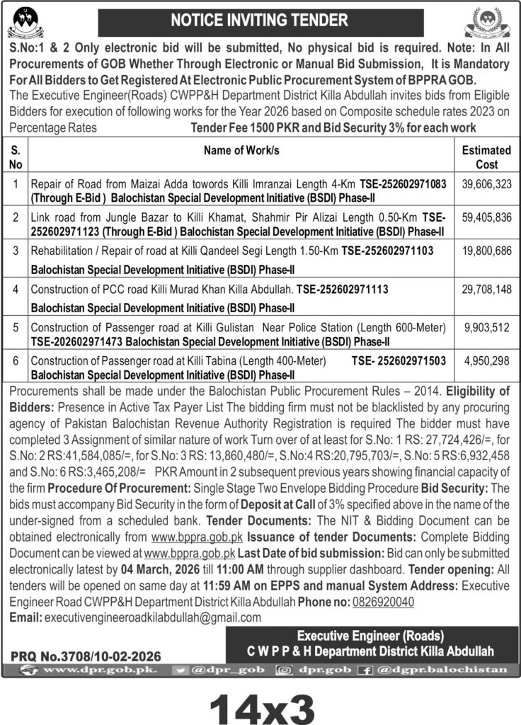 The deadline for electronic bid submission is 04 March 2026 at 11:00 AM, with tender opening at 11:59 AM the same day via EPPS and manual system. Bidders can obtain tender documents electronically from www.bppra.gob.pk. The Executive Engineer Roads office in Killa Abdullah is the contact point for queries.